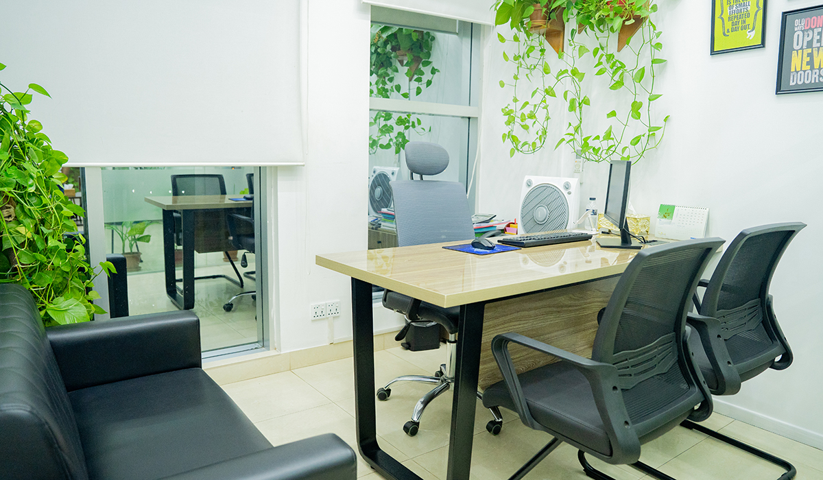 Indoor plants and natural textures are incorporated to improve air quality, reduce stress, and create a refreshing work environment.